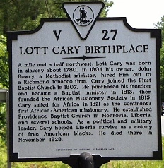 “A mile and a half northwest, Lott Cary was born in slavery about 1780. In 1804 his owner, John Bowry, a Methodist minister, hired him out to a Richmond tobacco firm. Cary joined the First Baptist Church in 1807. He purchased his freedom and became a Baptist minister in 1813, then founded the African Missionary Society in 1815. Cary sailed for Africa in 1821 as the continent’s first African-American missionary. He established Providence Baptist Church in Monrovia, Liberia, and several schools. As a political and military leader, Cary helped Liberia survive as a colony of free American blacks. He died there in November 1828.”
